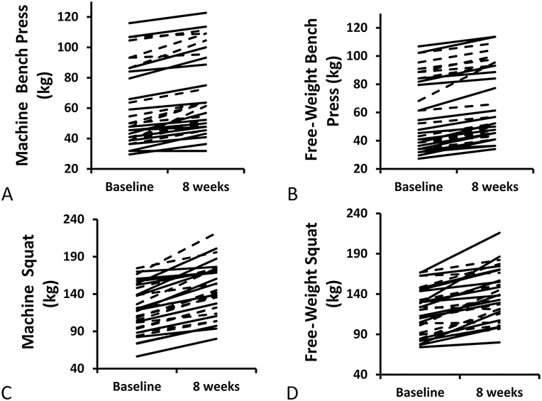 マシン群はフリーウェイト群よりも増加した(13.9 vs. 8.6%)。