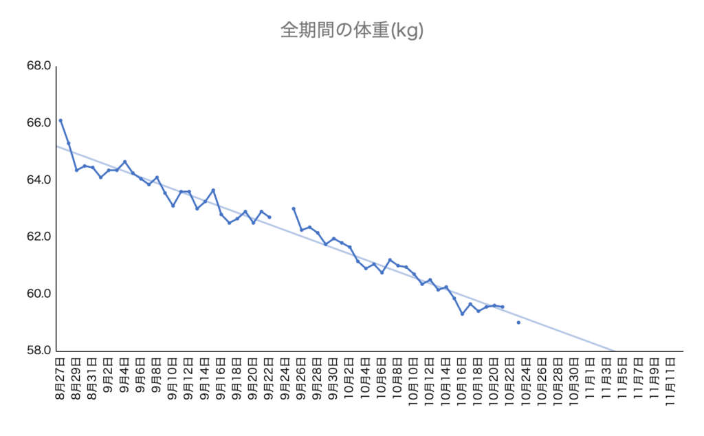 本人の素晴らしい努力の結果、体重は停滞もなく綺麗に右肩下がりで、